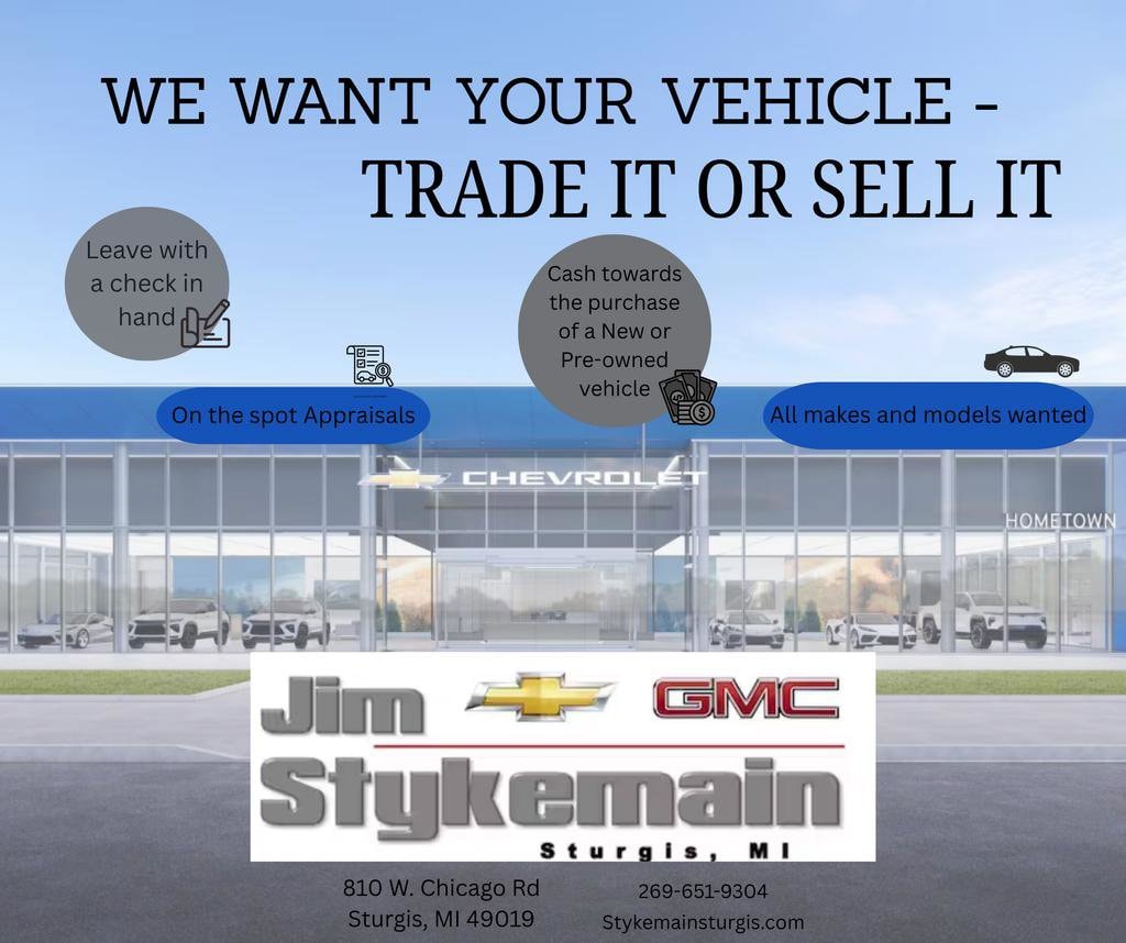 Jim Stykemain Chevrolet GMC in Sturgis MI is closer than you think. On the corner of M66 and US12 in Sturgis. Driving time to Jim Stykemain Chevrolet GMC: La Grange = 15 minutes, White Pigeon = 18 minutes, Three Rivers = 22 minutes, Coldwater = 30 minutes. Elkhart = ONLY 39 MINUTES! COME CHECK US OUT. Visit us online at STYKEMAINSTURGIS.COM Proudly serving: Sturgis, Howe, LaGrange, Elkhart, Kalamazoo, Angola, Portage, Battle Creek, Detroit, Indianapolis, South Bend, Fort Wayne, and all of greater Ohio, Michigan, and Indiana.