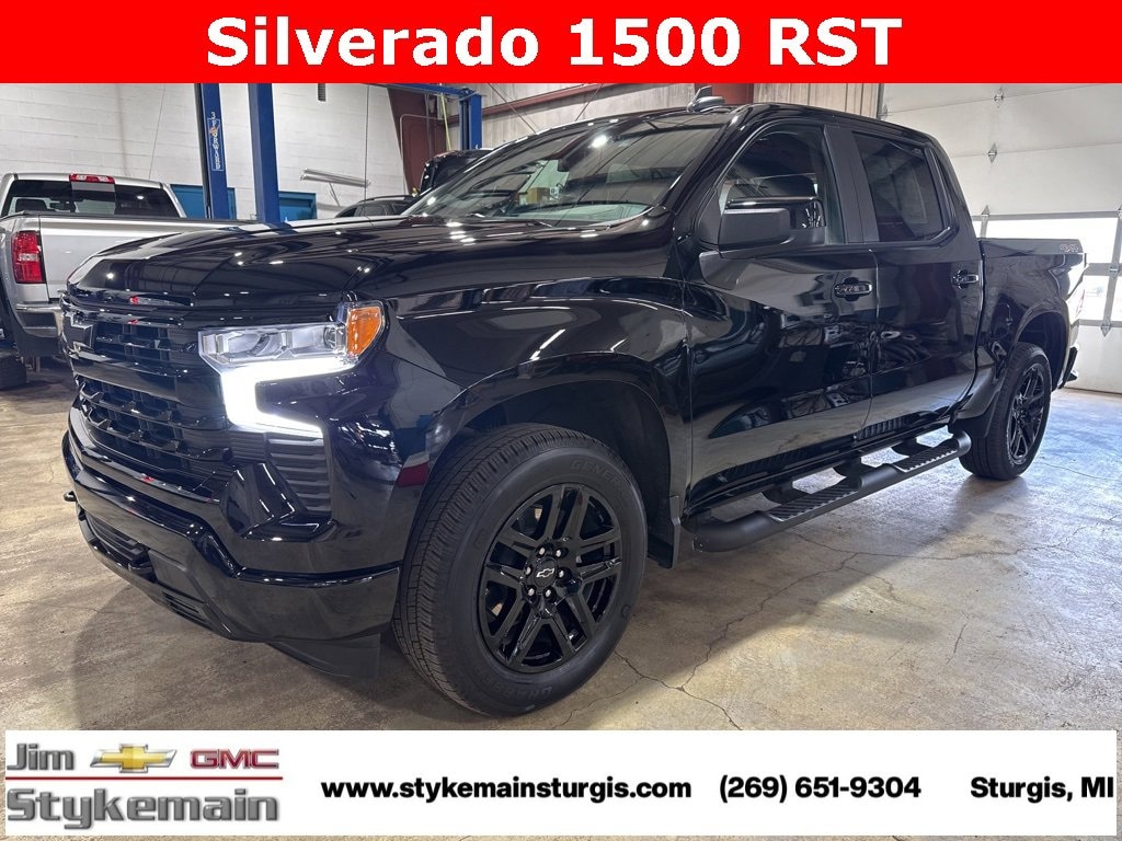 2023 Chevrolet Silverado 1500 RST Black * Apple CarPlay/Android Auto *, * USB ADAPTER *, * BLUETOOTH *, * HEATED SEATS *, * REMOTE ENGINE START *, * Park Assist *, * 4WD *, *** COMPLEMENTARY 3 MONTH - 3,000 MILE POWERTRAIN WARRANTY ***, Silverado 1500 RST, 4D Crew Cab, 2.7L Turbo, 4WD, Black, 10-Way Power Driver Seat w/Lumbar, 120-Volt Bed Mounted Power Outlet, 120-Volt Instrument Panel Power Outlet, 4-Wheel Disc Brakes, 4 Black Round Assist Steps (LPO), 40/20/40 Front Split-Bench Seat, 6 Speakers, 6-Speaker Audio System, Air Conditioning, All-Star Edition, AM/FM radio: SiriusXM with 360L, Apple CarPlay/Android Auto, Automatic Emergency Braking, Automatic temperature control, Bluetooth® For Phone, Brake assist, Convenience Package, Dual front impact airbags, Dual Rear USB Ports (Charge Only), Dual-Zone Automatic Climate Control, Electronic Stability Control, EZ Lift Power Lock & Release Tailgate, Following Distance Indicator, Forward Collision Alert, Front dual zone A/C, Front Pedestrian Braking, Front reading lights, Front wheel independent suspension, HD Rear Vision Camera, Heated Driver & Front Outboard Passenger Seats, Heated Power-Adjustable Outside Mirrors, Heated Steering Wheel, Heated steering wheel, High Capacity Suspension Package, Integrated Trailer Brake Controller, IntelliBeam Automatic High Beam On/Off, Keyless Open & Start, Lane Keep Assist w/Lane Departure Warning, LED Cargo Area Lighting, Low tire pressure warning, Overhead airbag, Panic alarm, Power driver seat, Power Front Windows w/Driver Express Up/Down, Power Rear Windows w/Express Down, Power steering, Preferred Equipment Group 1SP, Premium audio system: Chevrolet Infotainment 3 Premium, Radio data system, Radio: Chevrolet Infotainment 3 Premium System, Rear window defroster, Remote keyless entry, Security system, SiriusXM w/360L, Speed control, Speed-sensing steering, Standard Suspension Package, Standard Tailgate, Steering Wheel Audio Controls, Steering wheel mounted audio controls, Tachometer, Telescoping steering wheel, Theft Deterrent System (Unauthorized Entry), Tilt steering wheel, Traction control, Trailering Package, Variably intermittent wipers, Voltmeter, Wheels: 20 x 9 High Gloss Black Painted Alum, Wi-Fi Hot Spot Capable, Wireless Phone Projection, Wrapped Steering Wheel. Jim Stykemain Chevrolet GMC in Sturgis MI is closer than you think. On the corner of M66 and US12 in Sturgis. Driving time to Jim Stykemain Chevrolet GMC: La Grange = 15 minutes, White Pigeon = 18 minutes, Three Rivers = 22 minutes, Coldwater = 30 minutes. Elkhart = ONLY 39 MINUTES! COME CHECK US OUT. Visit us online at STYKEMAINSTURGIS.COM Proudly serving: Sturgis, Howe, LaGrange, Elkhart, Kalamazoo, Angola, Portage, Battle Creek, Detroit, Indianapolis, South Bend, Fort Wayne, and all of greater Ohio, Michigan, and Indiana.